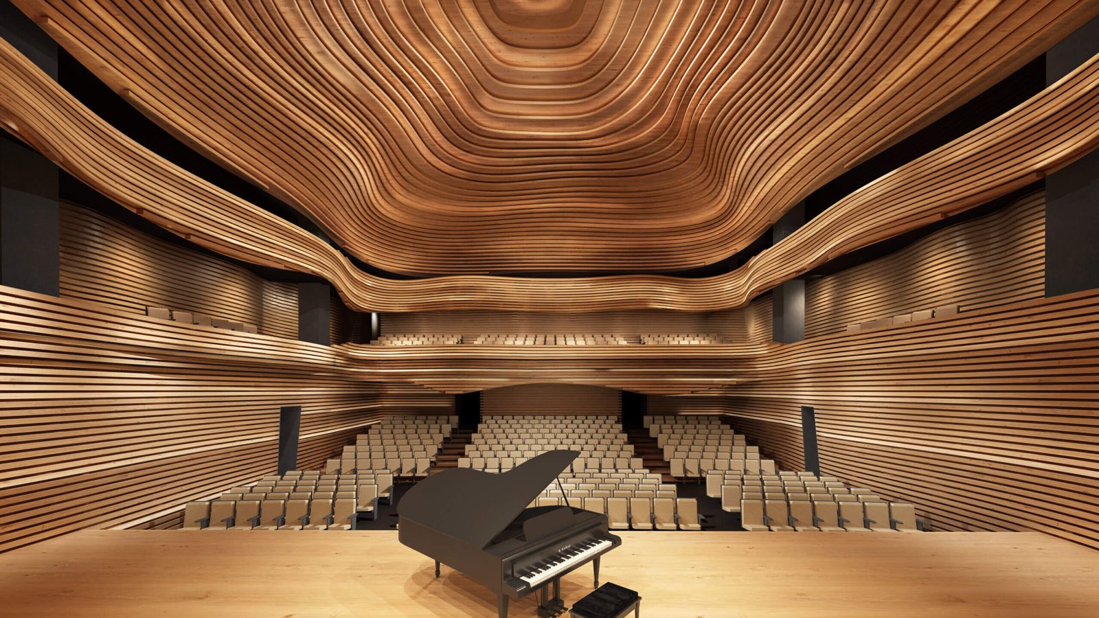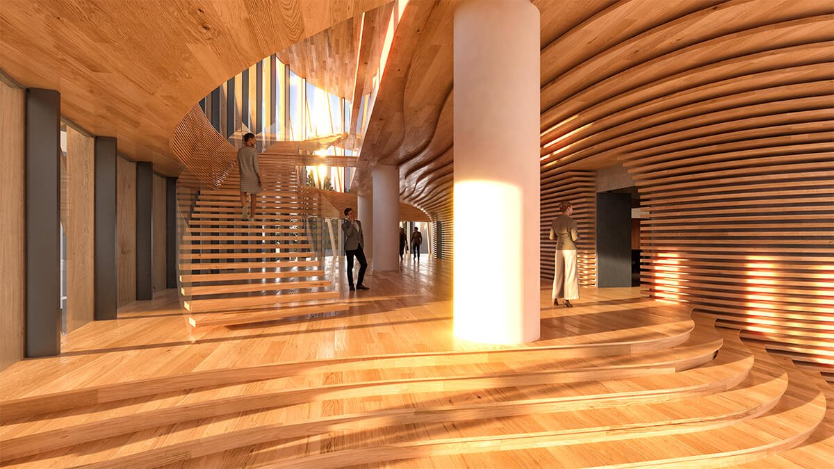 Within the preserved structure, the main auditorium is conceived as an organic interior, deliberately contrasting the rational geometry of the existing building. Inspired by the surrounding natural landscape of Gërmia, the interior introduces warmth, tactility, and spatial fluidity, creating an immersive acoustic and visual environment for music and performance.