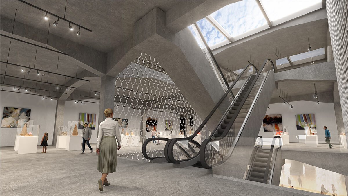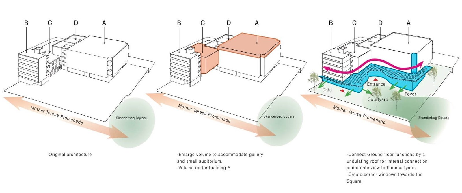 Sustainability is integrated as a fundamental component of the renovation strategy. The project incorporates stormwater harvesting systems and natural ventilation, while the new canopy is conceived as a green roof, contributing to environmental performance and microclimatic comfort. Through a careful balance of preservation and transformation, the project aims to safeguard Prishtina’s modernist heritage while establishing a contemporary cultural platform for Kosovo’s evolving art scene.
