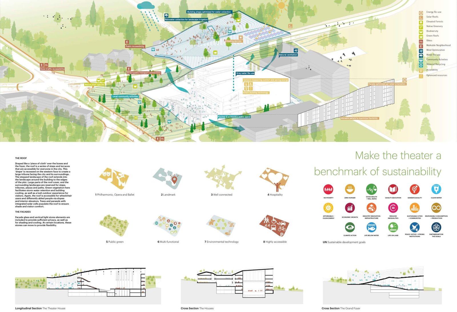 Along the route, terraces accommodate a rooftop bar and café, as well as entrances to interior programs including a restaurant, co-working spaces, rehearsal rooms, and the main theaters. During warmer seasons, the hill becomes an extension of public life—hosting informal gatherings, performances, and celebrations. From ground to roof, the building unfolds as a continuous public experience.