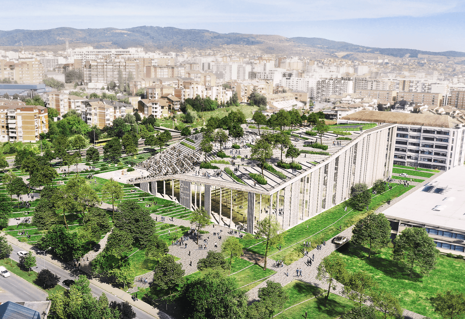 Draped like a continuous piece of cloth over the three programmatic houses and the central foyer, the roof unfolds as a series of accessible steps and terraces open to everyone in the city. On the western side, the drape is recessed to form a large urban tribune facing Prishtina and its wider landscape. The roof extends beyond the building envelope, merging seamlessly with the surrounding site and dissolving the boundary between architecture and ground.