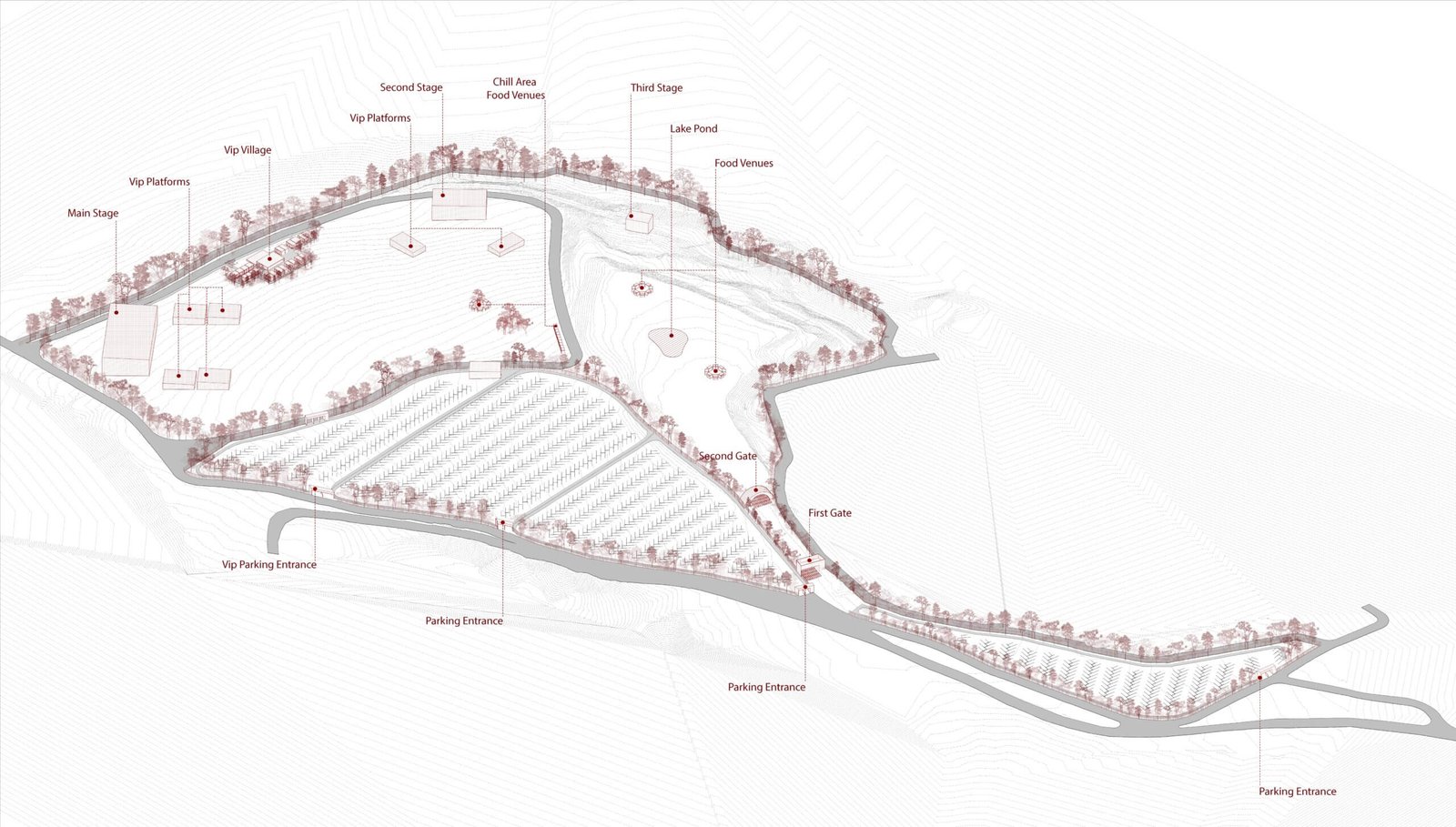 The masterplan establishes a clear spatial hierarchy that organizes stages, audience fields, service areas, emergency routes, and production infrastructure into a coherent and safe framework. Designed for peak capacity while remaining adaptable to different event scales, the venue integrates approximately 38,690 m² of green areas and preserves around 1,000 existing trees.